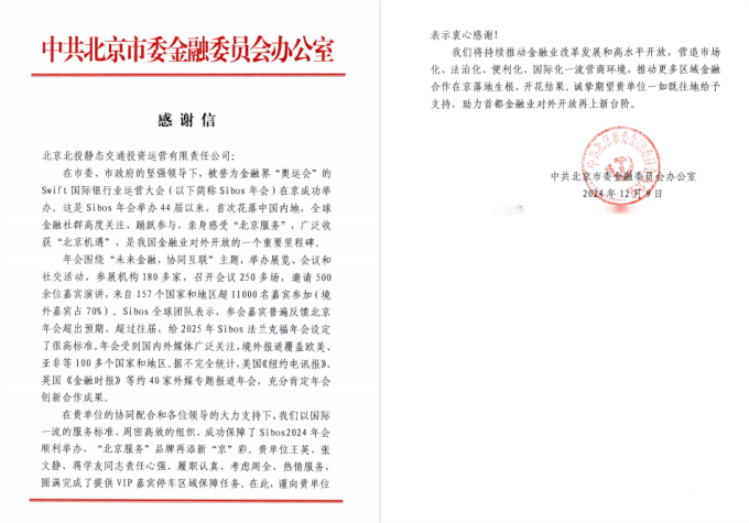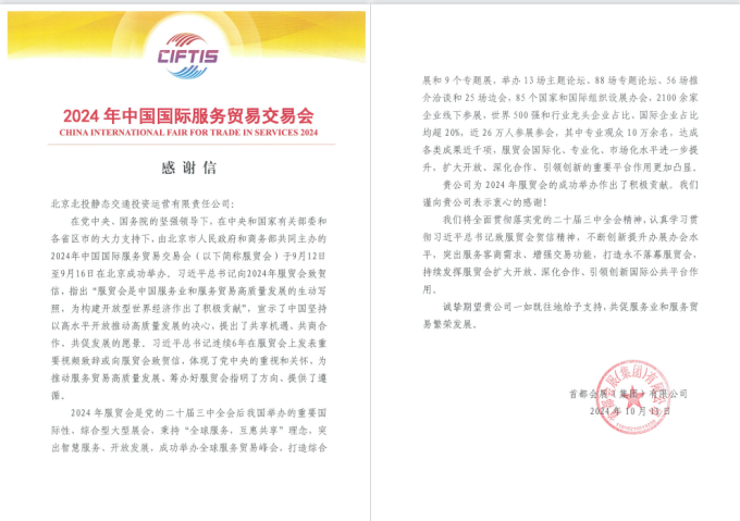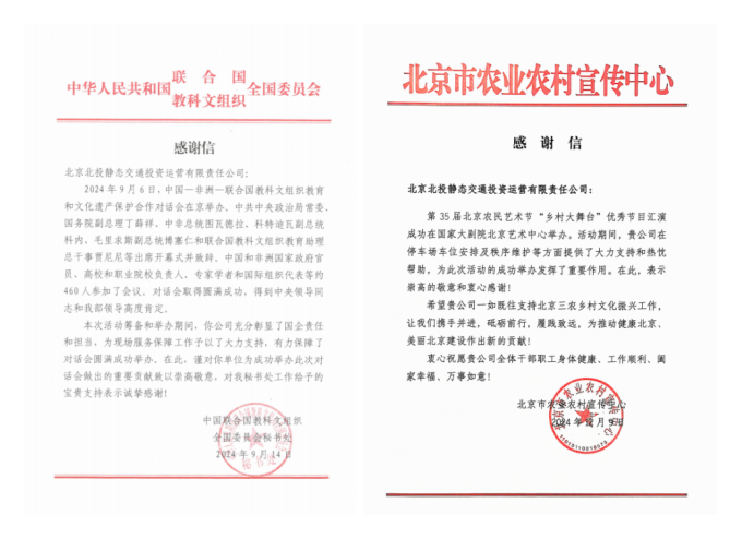同時(shí),近段時(shí)間以來(lái),北投靜態(tài)交通公司圓滿(mǎn)完成2024年中國(guó)國(guó)際服務(wù)貿(mào)易交易會(huì)、中國(guó)-非洲-聯(lián)合國(guó)教科文組織教育和文化遺產(chǎn)保護(hù)合作對(duì)話(huà)會(huì)、Sibos年會(huì)、第35屆北京農(nóng)民藝術(shù)節(jié)“鄉(xiāng)村大舞臺(tái)”優(yōu)秀節(jié)目匯演等重要活動(dòng)停車(chē)保障,先后收到中國(guó)聯(lián)合國(guó)教科文組織全國(guó)委員會(huì)秘書(shū)處、中共北京市委金融委員會(huì)辦公室、北京市農(nóng)業(yè)農(nóng)村宣傳中心等單位送來(lái)的感謝信,對(duì)公司提供的專(zhuān)業(yè)停車(chē)保障表示感謝。