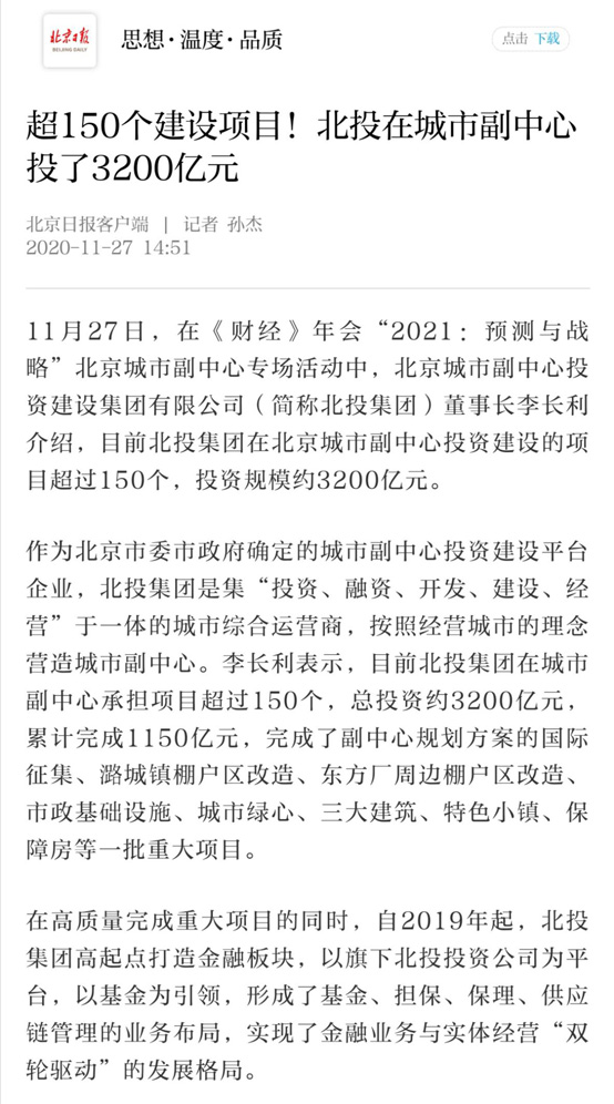 目前,北投集團(tuán)在城市副中心承擔(dān)項(xiàng)目超過(guò)150個(gè),總投資約3200億元,完成了副中心規(guī)劃方案的國(guó)際征集、潞城鎮(zhèn)棚戶區(qū)改造、東方廠周邊棚戶區(qū)改造、市政基礎(chǔ)設(shè)施、城市綠心、三大建筑、特色小鎮(zhèn)、保障房等一批重大項(xiàng)目。
