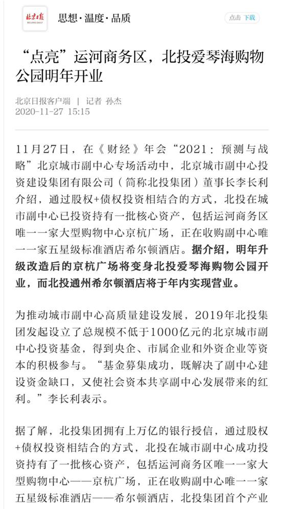 “十四五”時(shí)期,北投集團(tuán)將進(jìn)一步貫徹落實(shí)黨的十九屆五中全會(huì)精神和習(xí)近平總書記在北京考察時(shí)的重要講話精神,全面貫徹新發(fā)展理念,全力推動(dòng)城市副中心高質(zhì)量建設(shè)發(fā)展,為將城市副中心打造成為國(guó)際一流的和諧宜居之都示范區(qū)、新型城鎮(zhèn)化示范區(qū)、京津冀區(qū)域協(xié)同發(fā)展示范區(qū),助力通州區(qū)繁榮發(fā)展,作出新的更大貢獻(xiàn)。